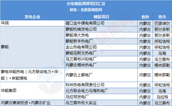 以上主要为风电、光伏等新能源发电侧配置储能项目动态,除此之外,据北极星储能网统计,内蒙古地区还有蒙能集团、华润集团华能集团等开展了13个火电储能联合调频项目。