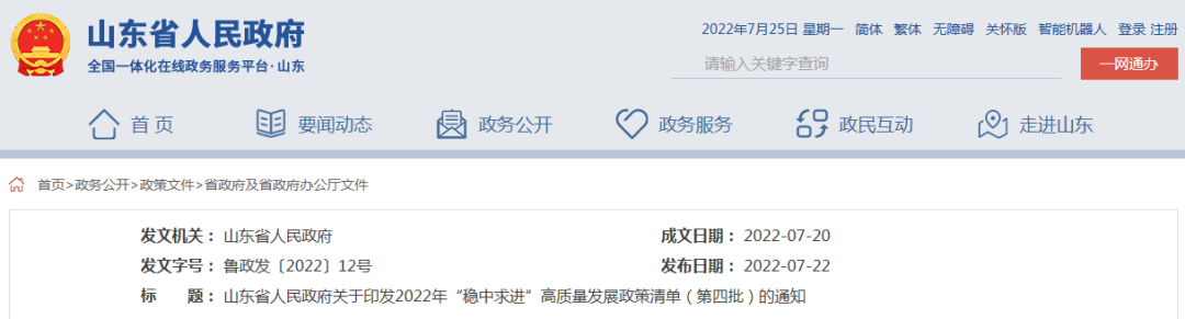 山东省人民政府办公厅2022年7月20日印发