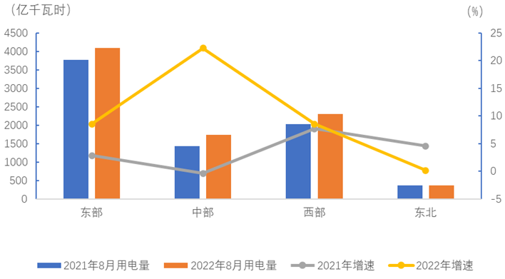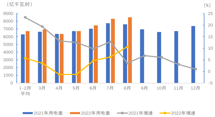分产业看①,1-8月,第一产业用电量767亿千瓦时,同比增长11.0%;第二产业用电量37674亿千瓦时,同比增长1.4%;第三产业用电量10143亿千瓦时,同比增长6.1%;城乡居民生活用电量9255亿千瓦时,同比增长15.8%。