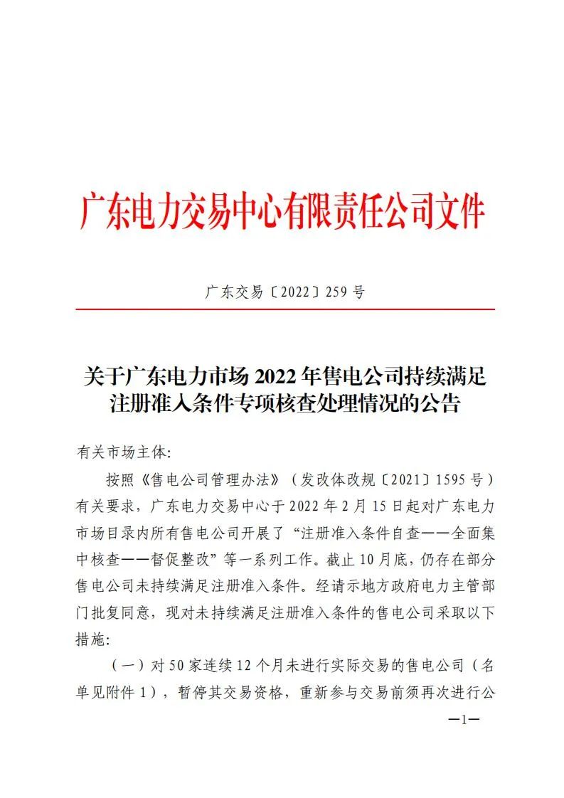 日前广东电力交易中心发布关于广东电力市场2022年售电公司持续满足注册准入条件专项核查处理情况的公告,公告显示,对50家连续12个月未进行实际交易的售电公司暂停交易资格,对39家近12个月内有进行实际交易但经核查确认“未持续满足注册准入条件”的售电公司,限制新增零售合同交易,完成整改并审核通过后,恢复新增零售合同交易资格。