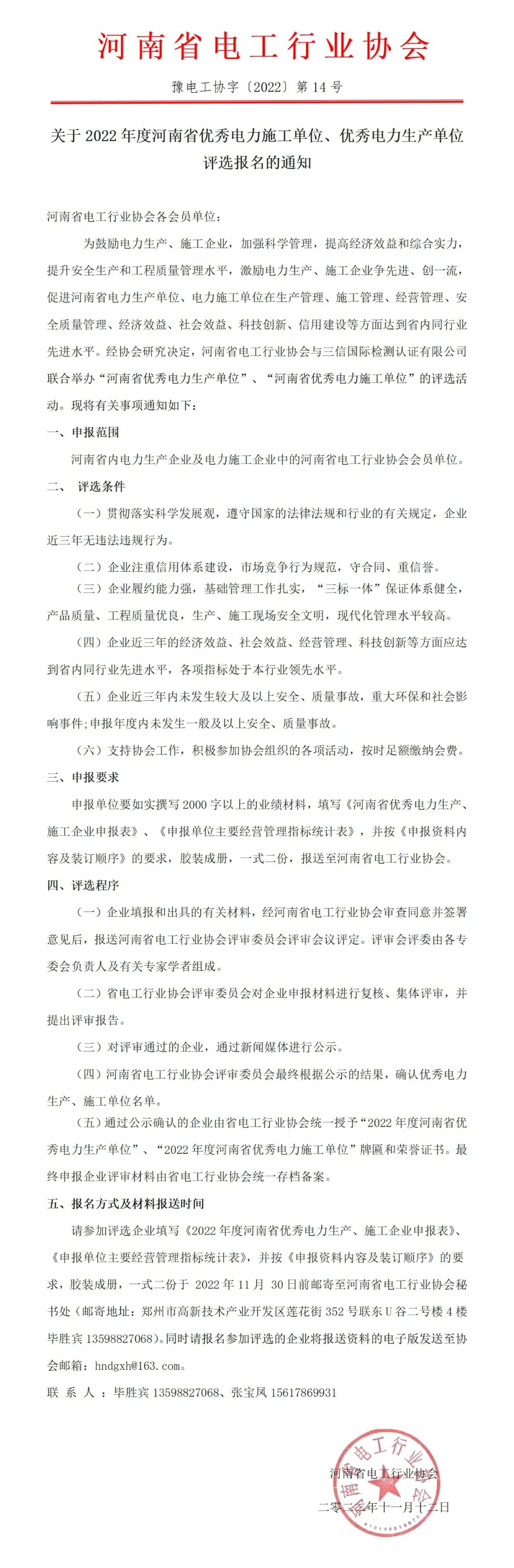 关于2022年度河南省优秀电力施工单位、优秀电力生产单位评选的通知