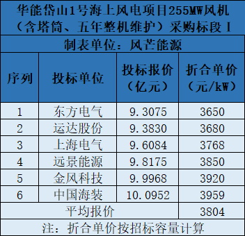项目共有6家整机商竞标,平均报价为3804元/kW。其中东方电气报价最低,投标报价为9.31亿元,折合单价为3650元/kW。