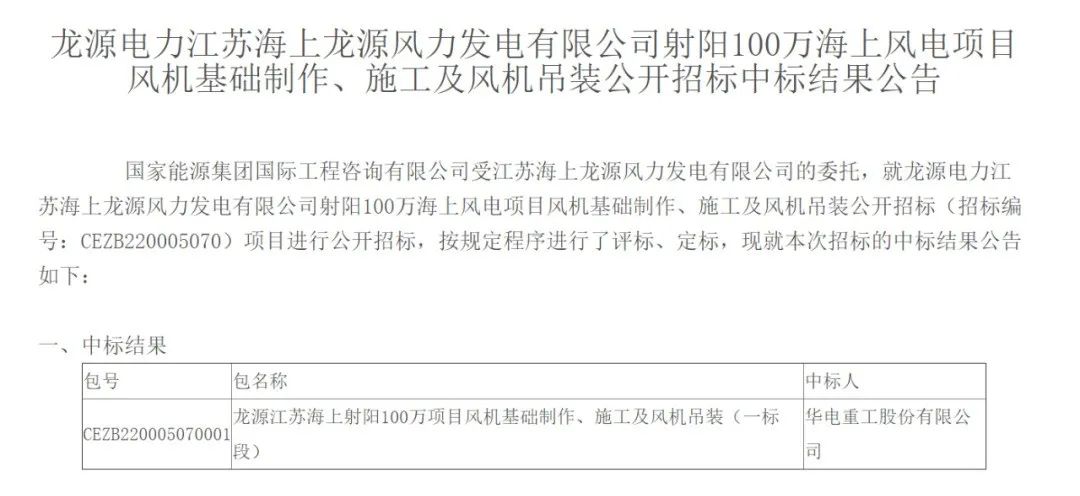 公告显示,华电重工成功中标龙源江苏海上射阳100万项目风机基础制作、施工及风机吊装(一标段),投标报价:140600.162455万元;成功中标龙源江苏海上射阳100万项目海上升压站建安二标段,投标报价:14600万元。
