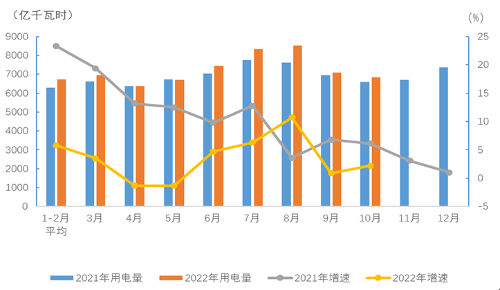 2022年1-10月,第一产业用电量947亿千瓦时,同比增长9.9%;第二产业用电量47086亿千瓦时,同比增长1.7%;第三产业用电量12479亿千瓦时,同比增长4.2%;城乡居民生活用电量11247亿千瓦时,同比增长12.6%。