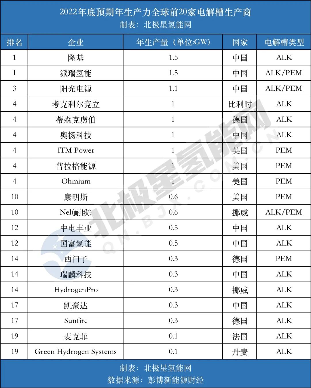据彭博新能源财经分析师表示,到2030年全球电解槽装机规模将增长120倍以上,从如今的2GW到2030年的242GW。近日,彭博新能源排列了2022年底和2023年底按预期年生产能力的全球前20家电解槽(碱性电解槽和PEM电解槽)生产商。