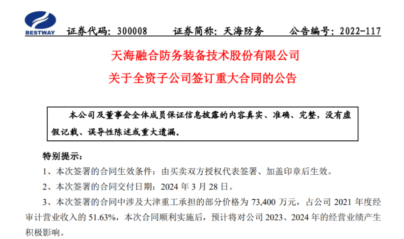 此次合同中涉及大津重工承担的部分中标金额为7.34亿元,占天海防务2021年度经审计营业收入的51.63%。大津重工主要承担该项目的建造、设备安装、调试、试验、试航、船级社检验及发证、培训、售后质保服务等合同义务及相关责任;负责船舶在青岛海西基地的安全环保工作。