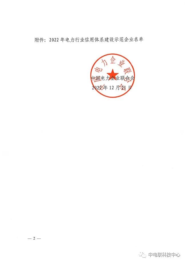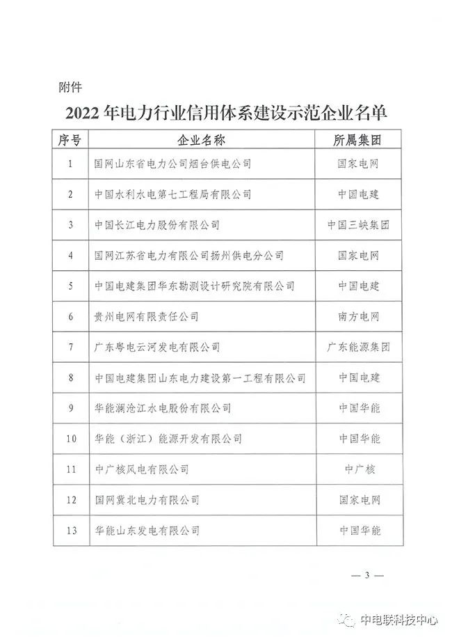 中电联关于公布2022年电力行业信用体系建设示范企业名单的通知