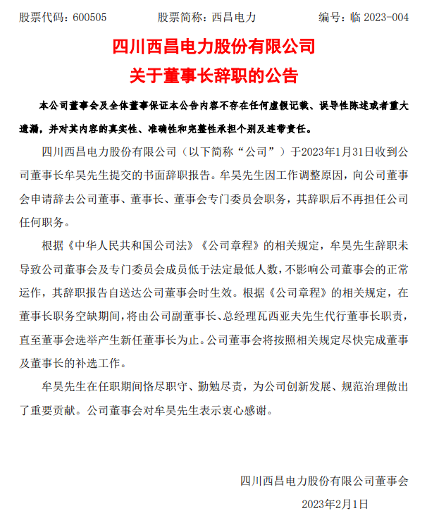 四川西昌电力股份有限公司于2023年1月31日收到公司董事长牟昊先生提交的书面辞职报告。牟昊先生因工作调整原因,向公司董事会申请辞去公司董事、董事长、董事会专门委员会职务,其辞职后不再担任公司任何职务。