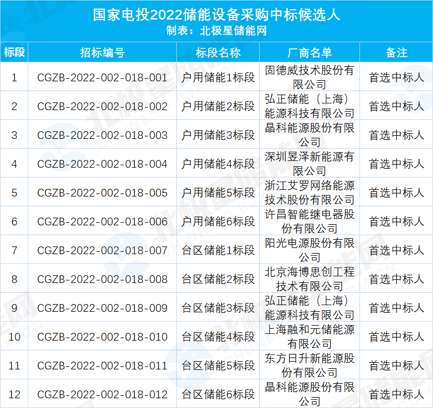 3月10日,国家电投2022年度900MWh储能设备采购中标结果公示,12个标段共十家企业入选成为中标候选人,弘正储能和晶科能源分别夺得两个标段。