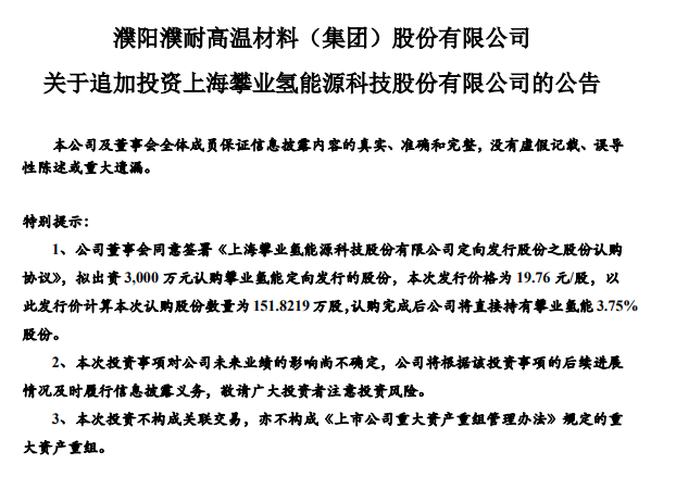濮耐股份拟3000万元认购攀业氢能定向发行的股份