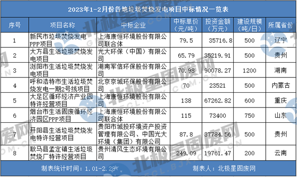 1-2月共开标8座垃圾焚烧发电项目,总投资金额超38亿人民币,新增生活垃圾焚烧处理能力4750吨/日,平均吨投资额高达80.6万元/吨,生活垃圾处理费平均单价为109.5元/吨,具体中标情况如下图所示: