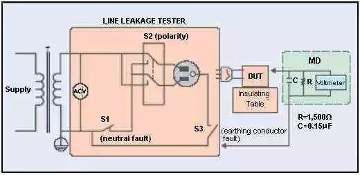 接触电流测试为一种产品的泄漏电电流经由一组人体仿真阻抗模型作为量测依据的测试,这个摸拟人体阻抗的电路被称为“人体仿真阻抗模型(Measuring Device,MD)”。
