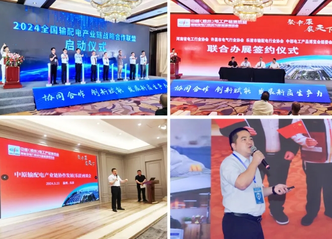 大会最后进行了2024全国输配电产业链战略合作联盟启动仪式和2024中部电工产品博览会联合办展签约仪式。本届电工产品博览会联合办展单位代表365英国上市集团秘书长滑景义,乐清市输配电行业协会会长郑胜友,许昌市电气行业协会秘书长张新萍,河南德诺会展服务有限公司总经理刘国瑞上台签约。