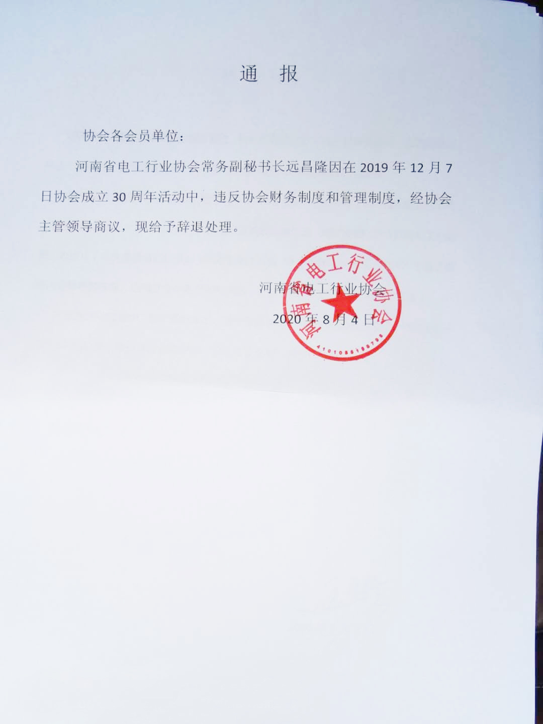 关于协会常务副秘书长远昌隆违反协会财务制度给予辞退的通报!