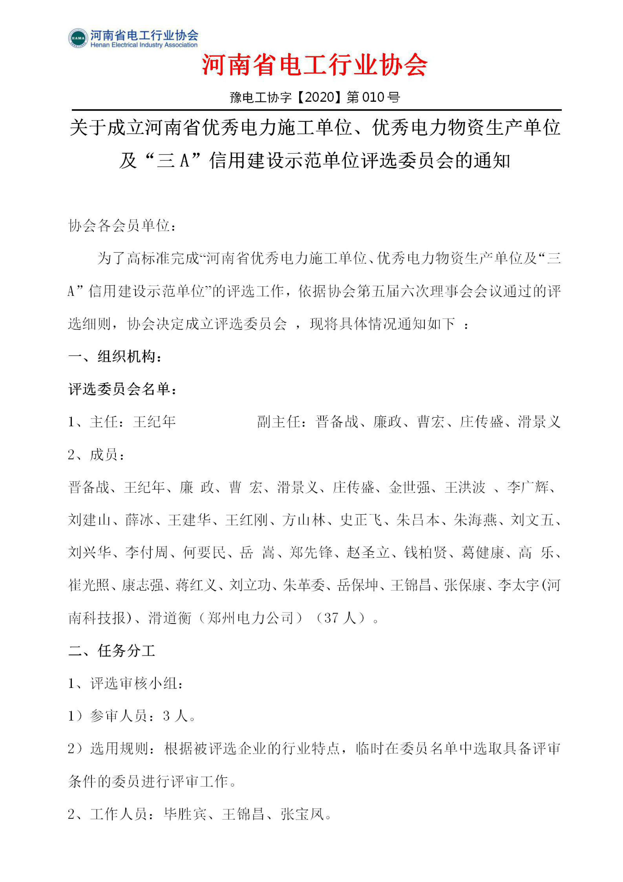 【通知】关于成立河南省优秀电力施工单位、优秀电力物资生产单位及“三A”信用示范单位评选委员会的通知
