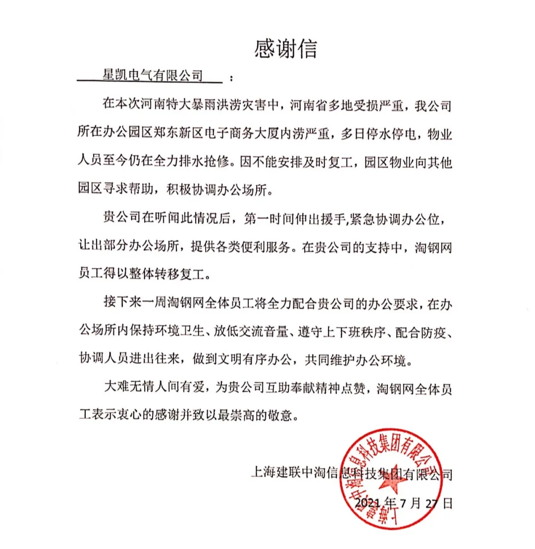 星凯电气在得到消息后立即结合物业,将自己公司的业务人员及售后外出人员工位调整合并,又把公司公共的茶水区、会客区、接待区、会议室全部整理出来,安置淘钢网工作人员,并免费提供水、电、网络,实现了淘钢网的正常办公,把损失降到了最低。