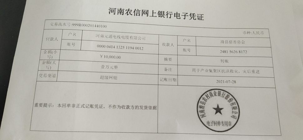 一方有难,八方支援,河南元通电线电缆有限公司发挥企业社会责任,尽企业绵薄之力,捐赠善款1万元。助力抗洪救灾,河南加油,滑县加油!