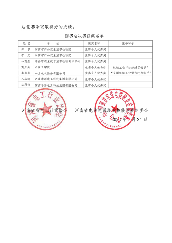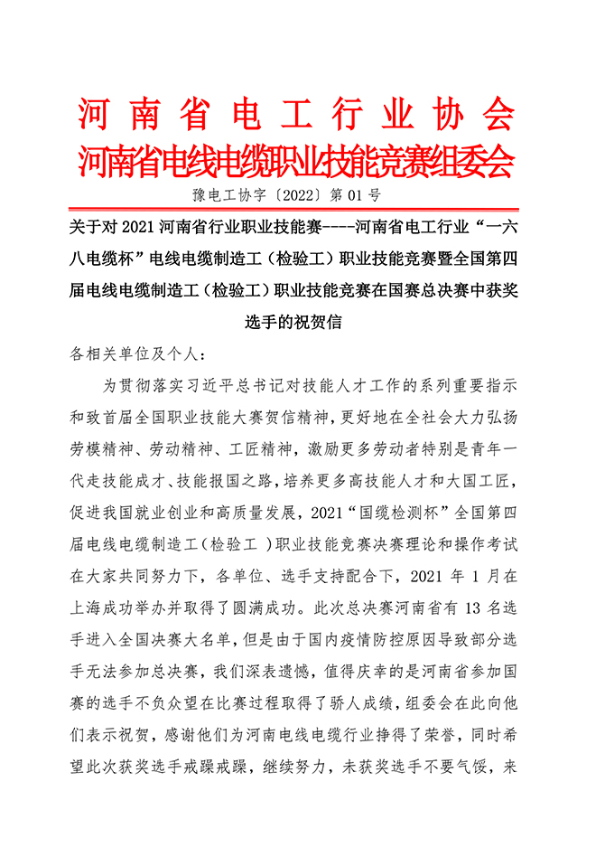 关于对2021河南省行业职业技能赛暨全国第四届电线电缆制造工(检验工)职业技能竞赛在国赛总决赛中获奖选手的祝贺信