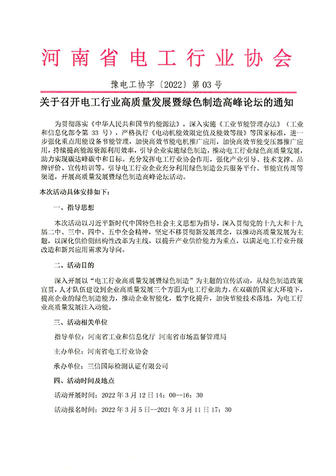 关于召开电工行业高质量发展暨绿色制造高峰论坛的通知