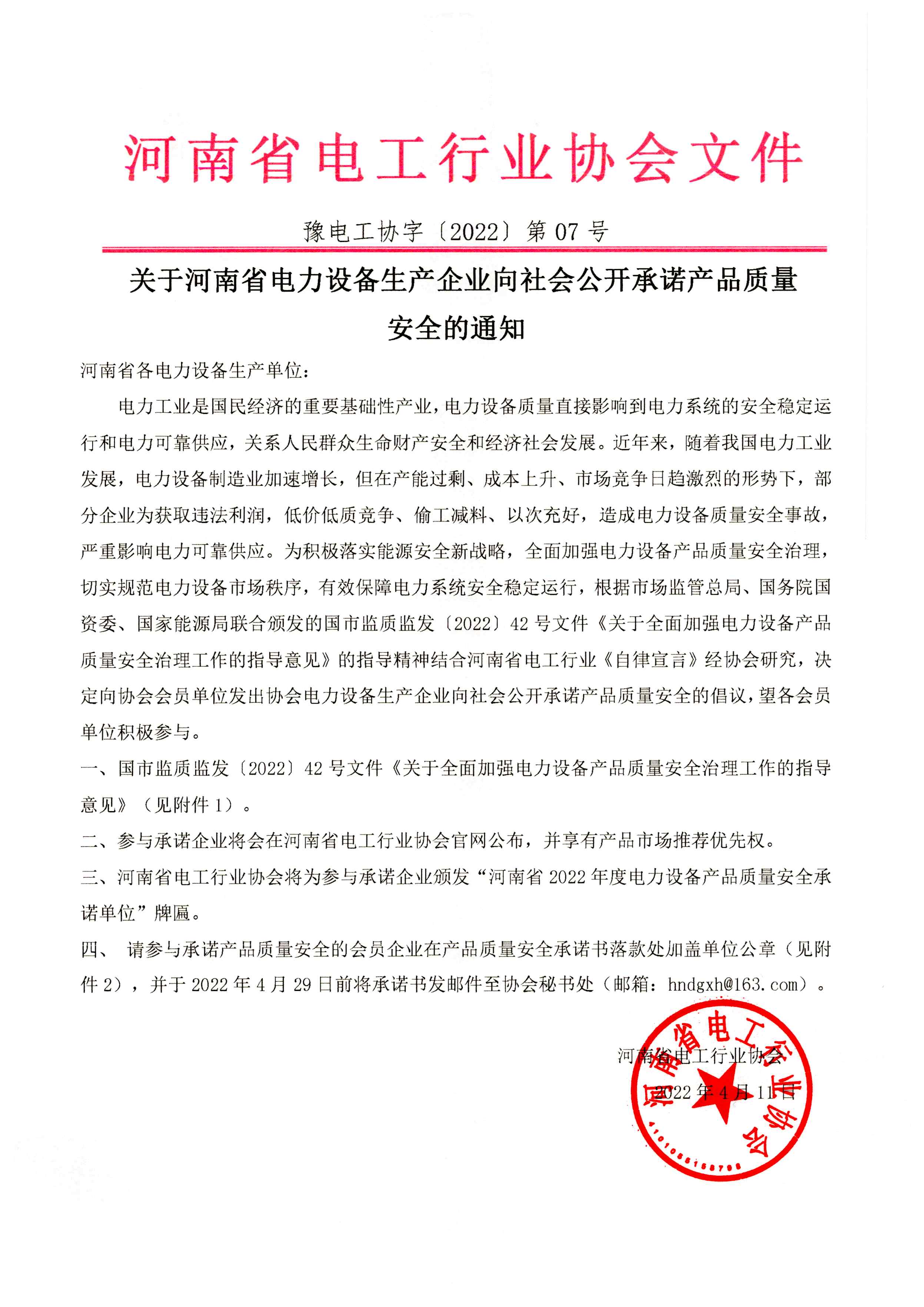 关于河南省电力设备生产企业向社会公开承诺产品质量安全的通知