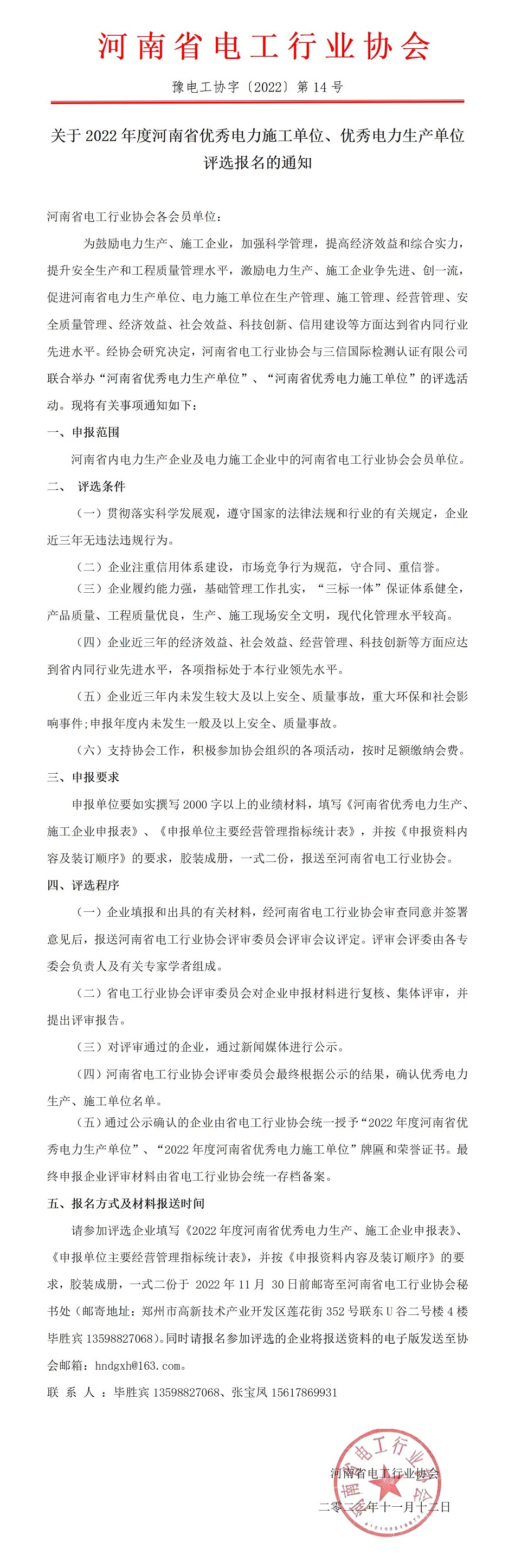 关于 2022 年度河南省优秀电力施工单位、优秀电力生产单位 评选报名的通知